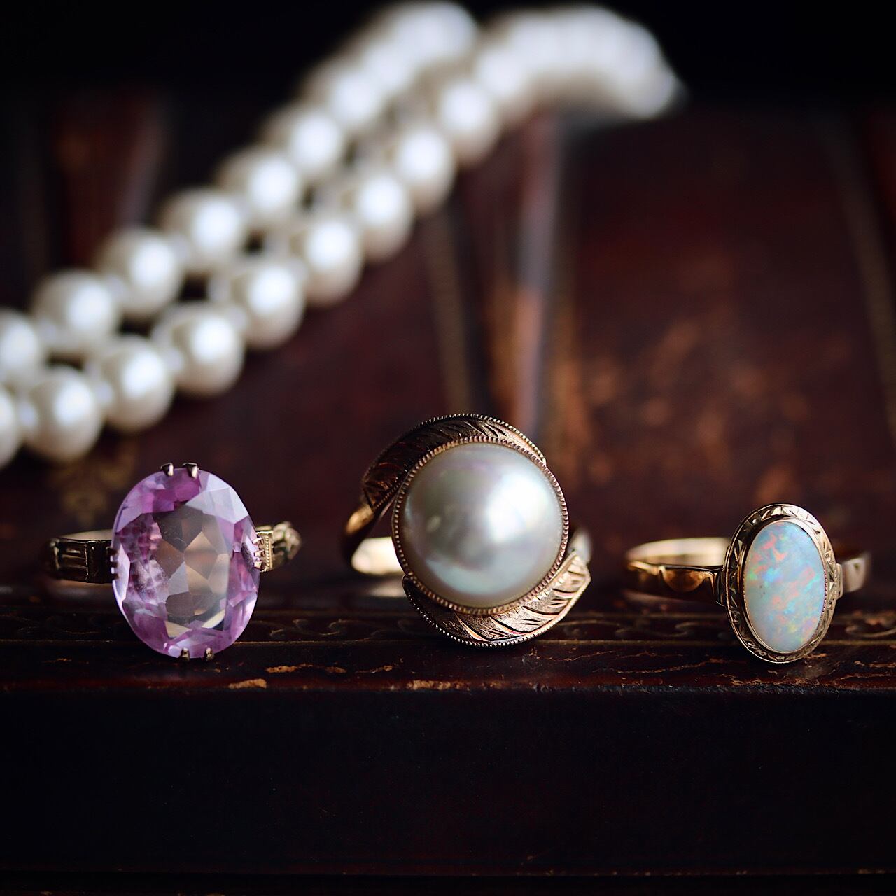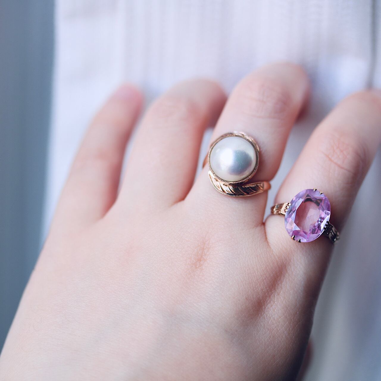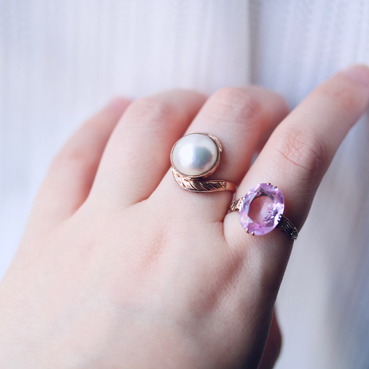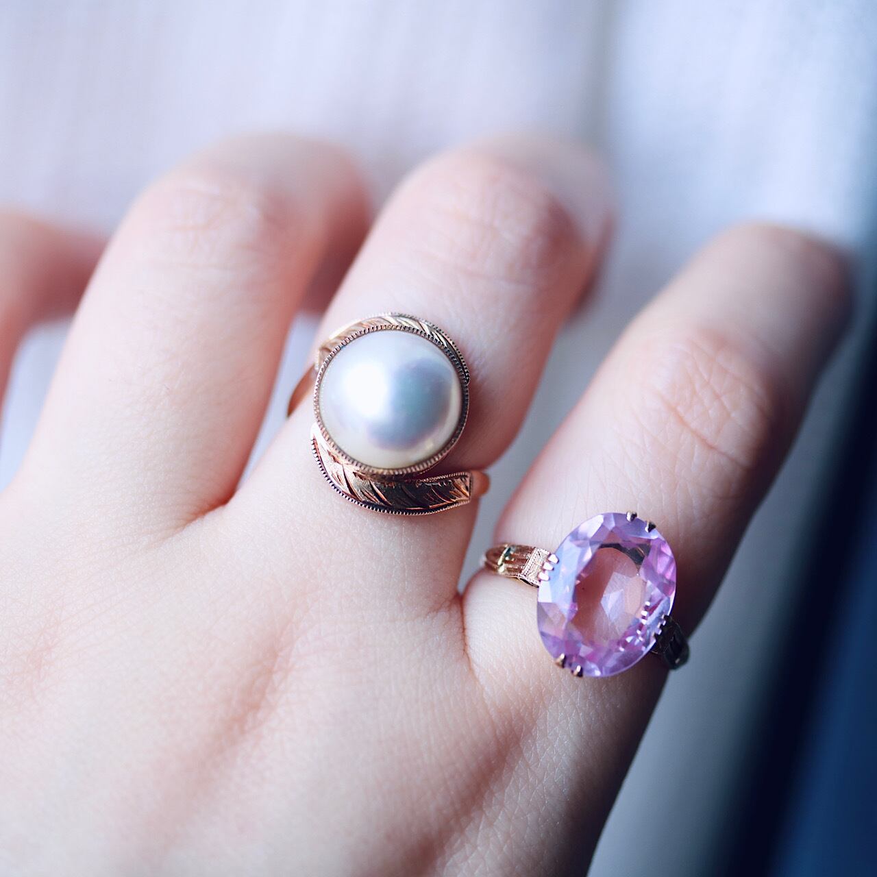 長い年月を経たヴィンテージリングになりますので、パールの一部に傷はあるものの、虹色の干渉色が見られる美しいマベパールをお楽しみ頂けます。