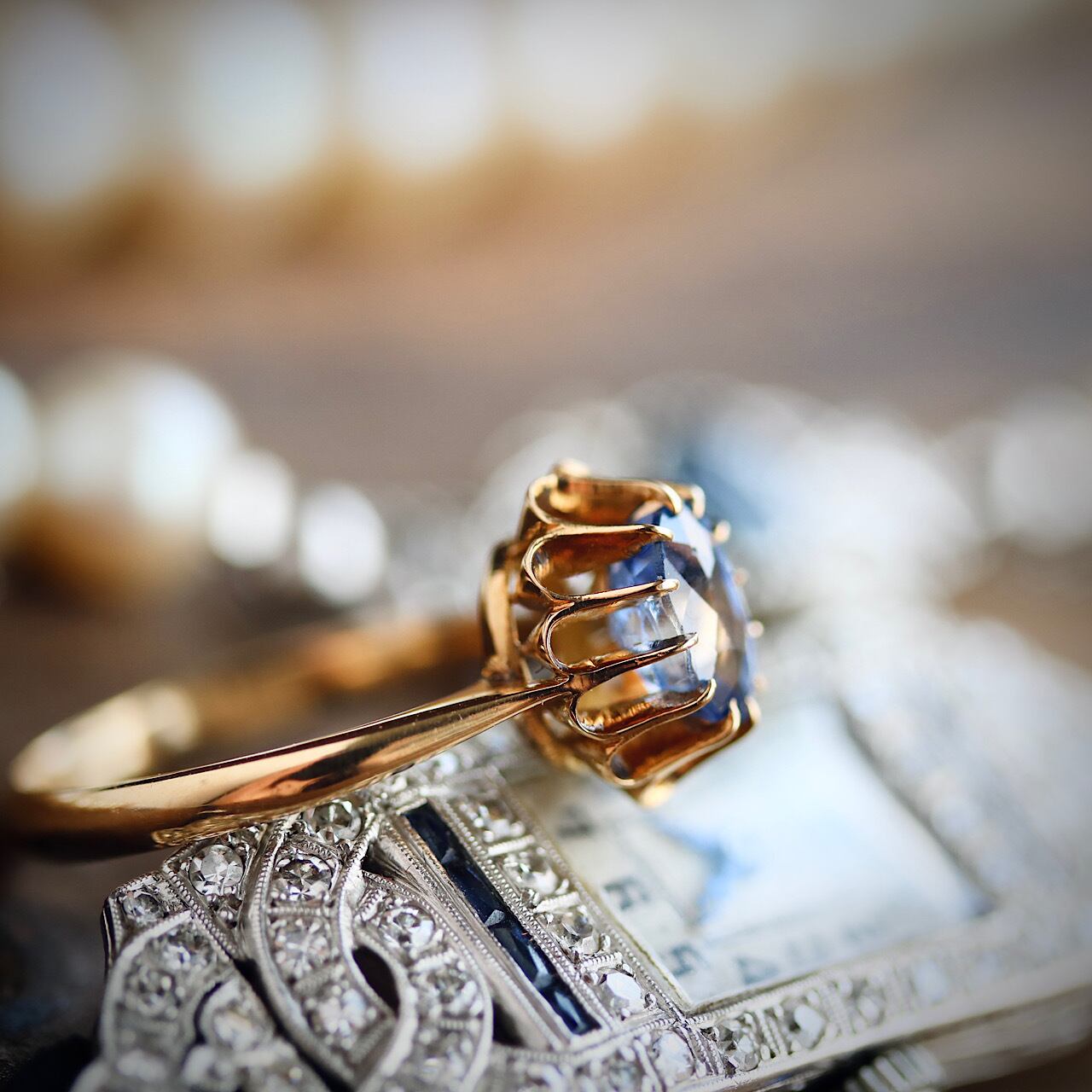 K18 天然サファイアの菊爪ヴィンテージリング。