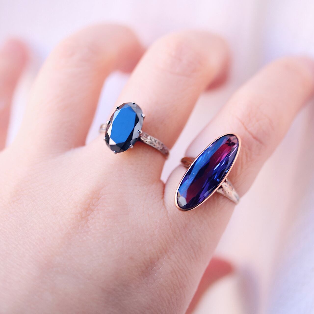 大きな縦長のオーバルカットにシンプルな覆輪留めのデザインで大人の女性の装いを上品に引き立ててくれます。