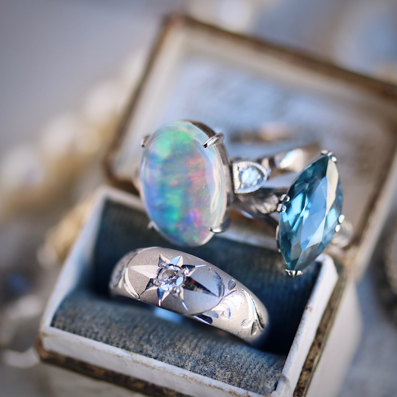 少し珍しいカラーで冬の冷たい空気感を連想させる美しいヴィンテージリングです。