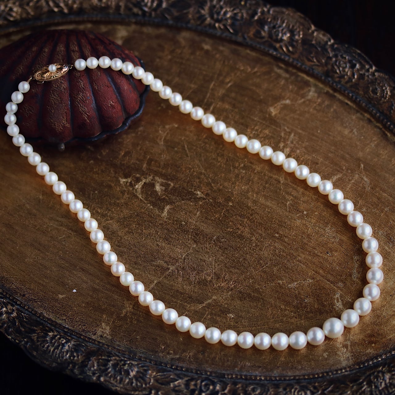 K18 グラデーションあこやのヴィンテージパールネックレス。