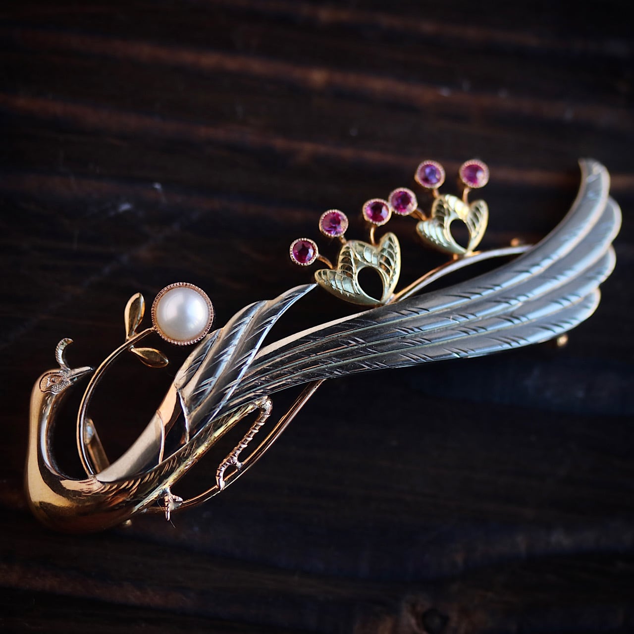K18 WG 真珠と合成ルビー 孔雀のアンティーク帯留め。大正〜昭和初期。
