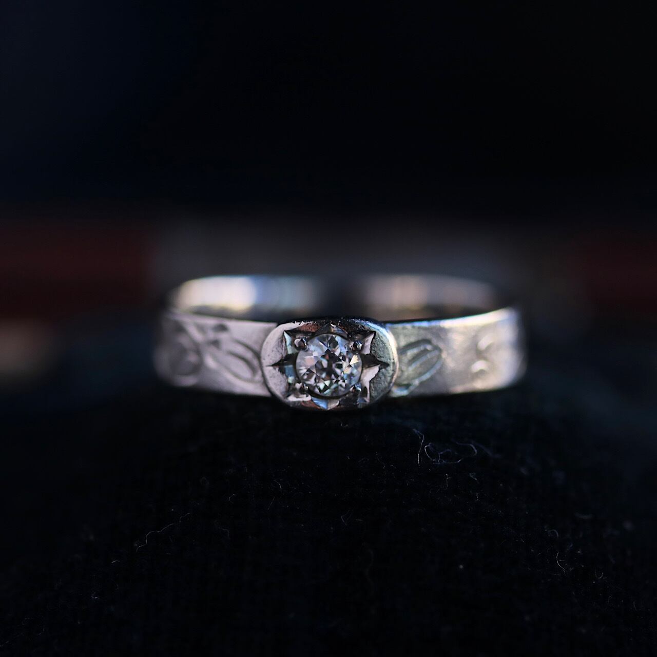 一粒のオールドヨーロピアンカットダイヤモンドが星留めされた珍しい平打ちリング。
