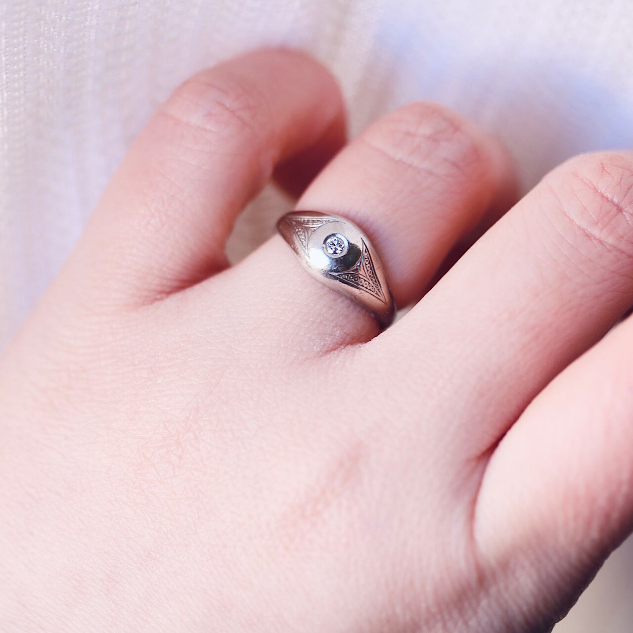 中央のダイヤモンドは小さいながらも美しく凛とした表情でとても存在感があります。