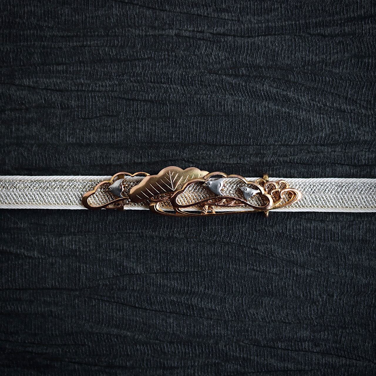 地金は9金製のピンクゴールドの色味で、帯留めの表面にイエローゴールド、千鳥にはホワイトゴールドが張られています。
