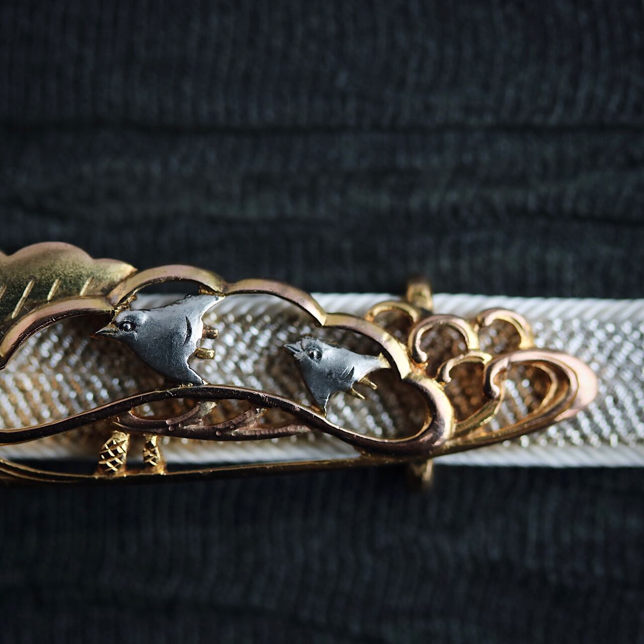 帯留め表面はイエローゴールド張り、千鳥はホワイトゴールド張り。