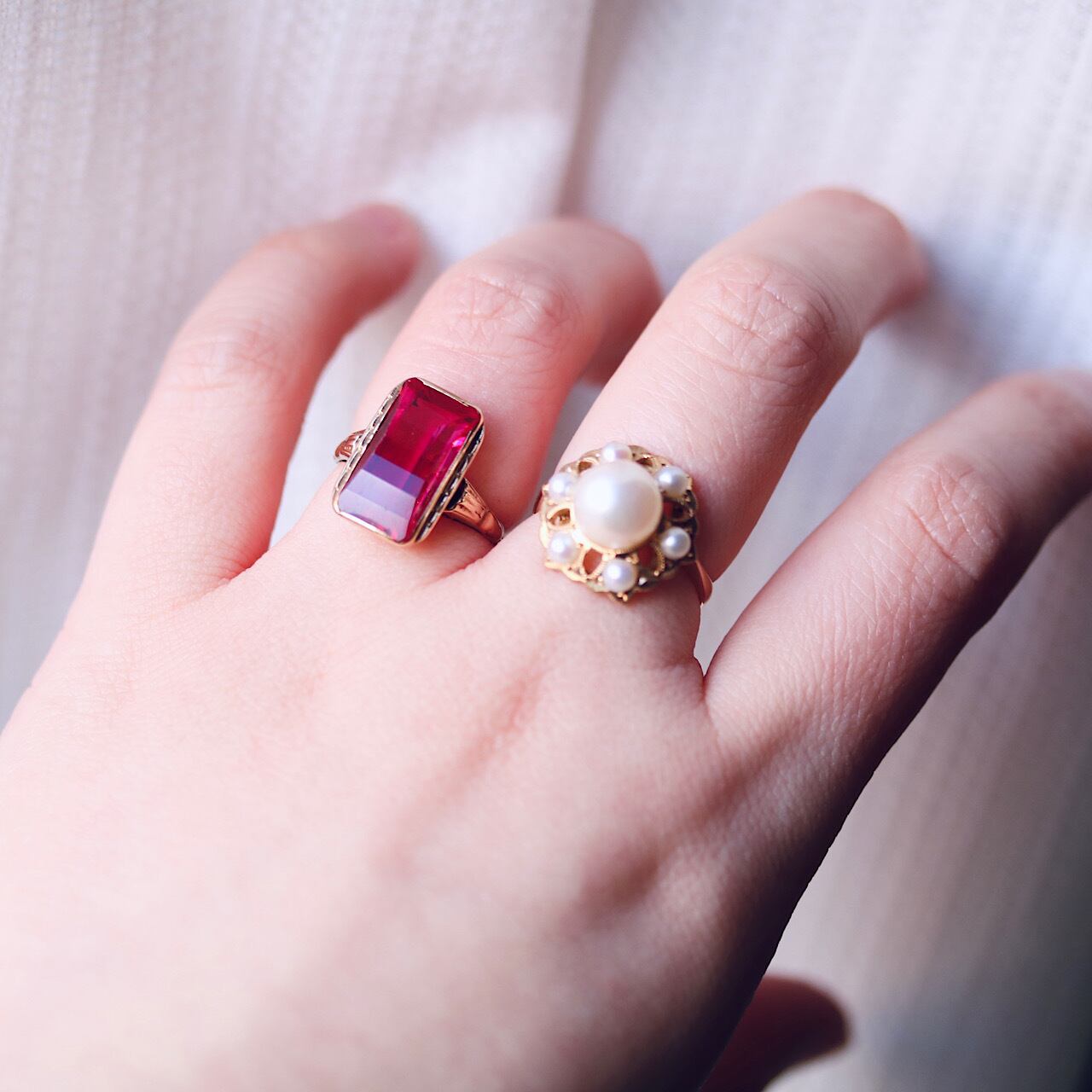 ベリーピンク色の合成石ルビーが可愛らしい、大人可愛いヴィンテージリング。