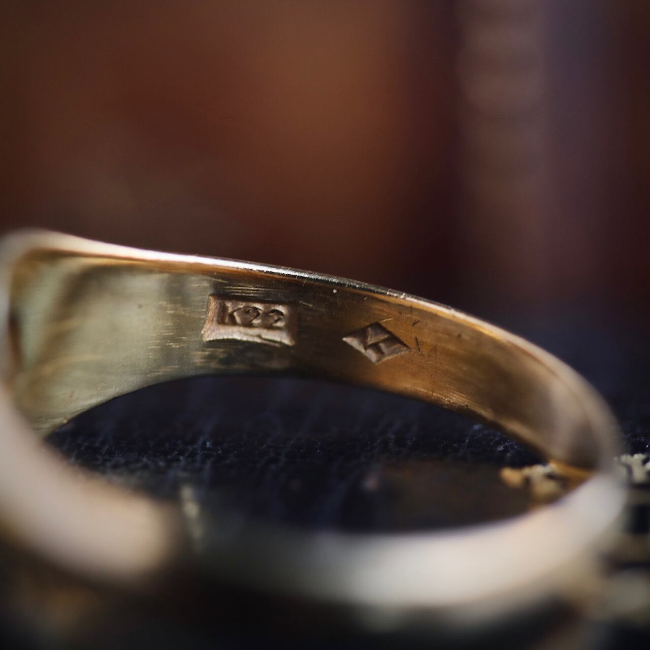 現代の月形甲丸リングと比べるとぽってりとした厚みのある独特な形状のリングで大正期に流行していたデザインと思われます。