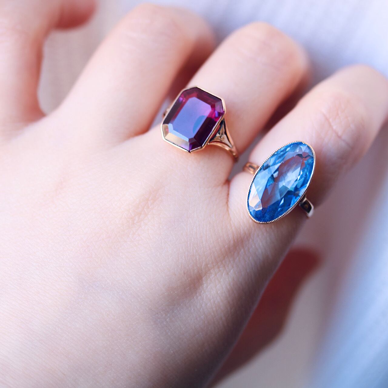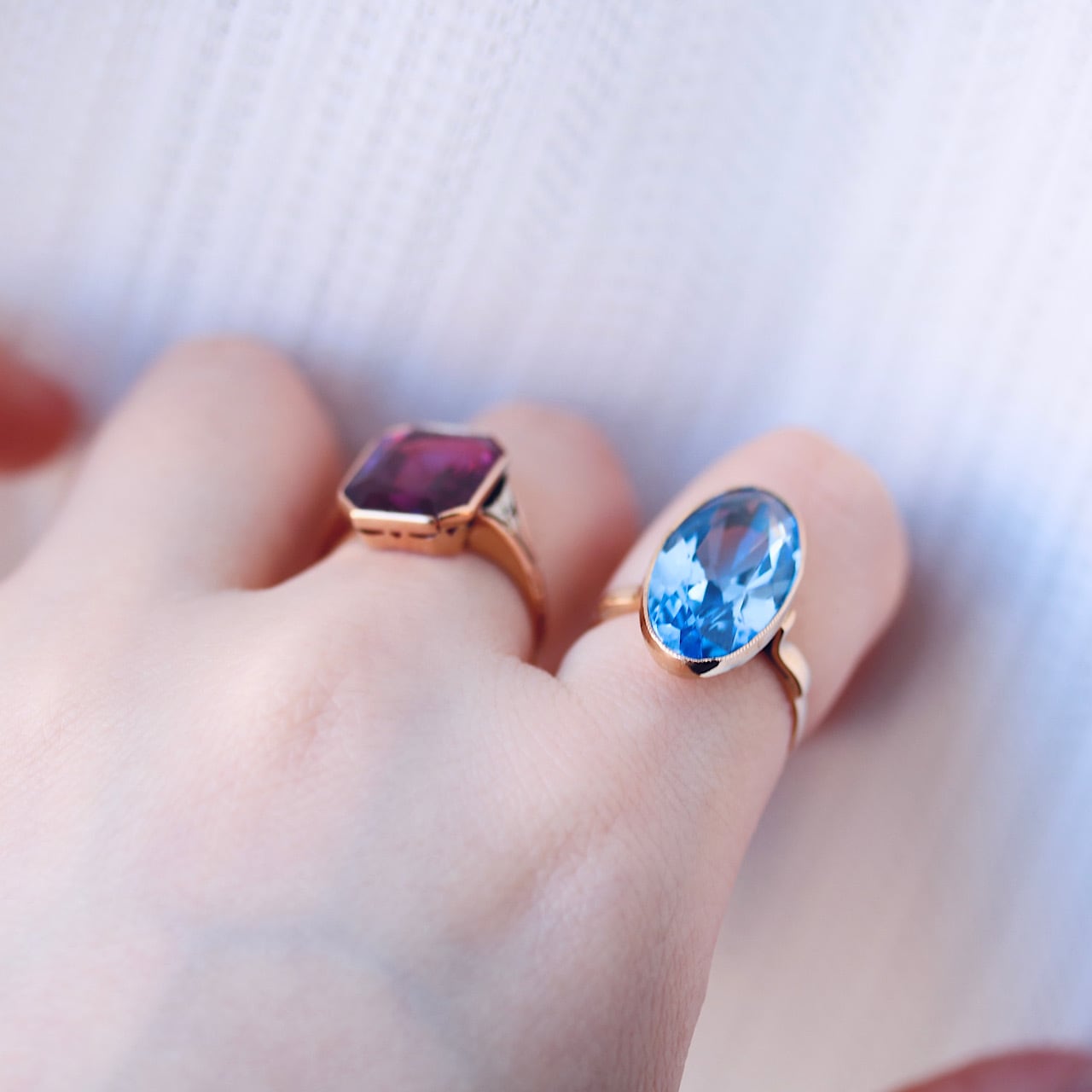 吸い込まれるような美しさのブルーカラーの合成石が魅力的なヴィンテージリング。