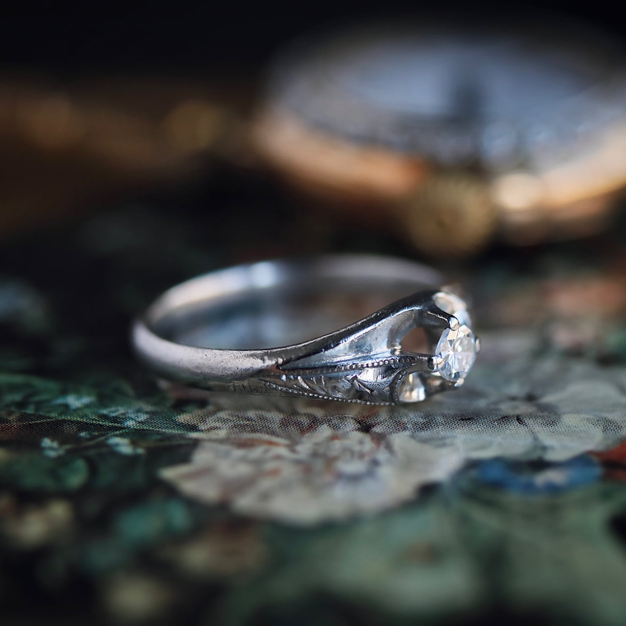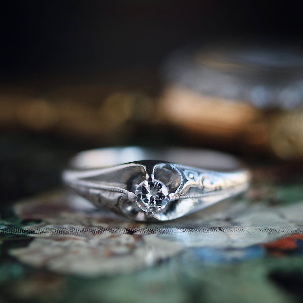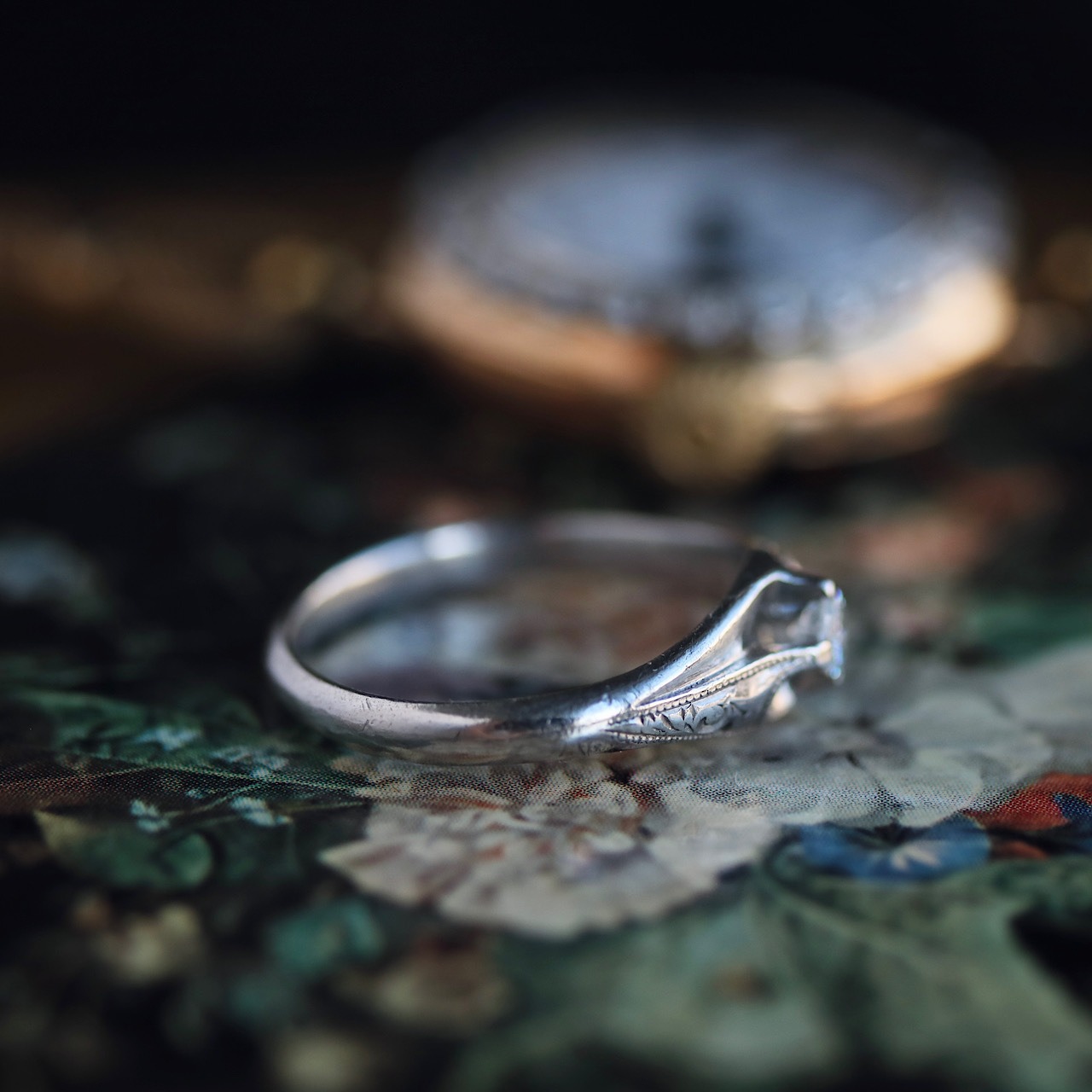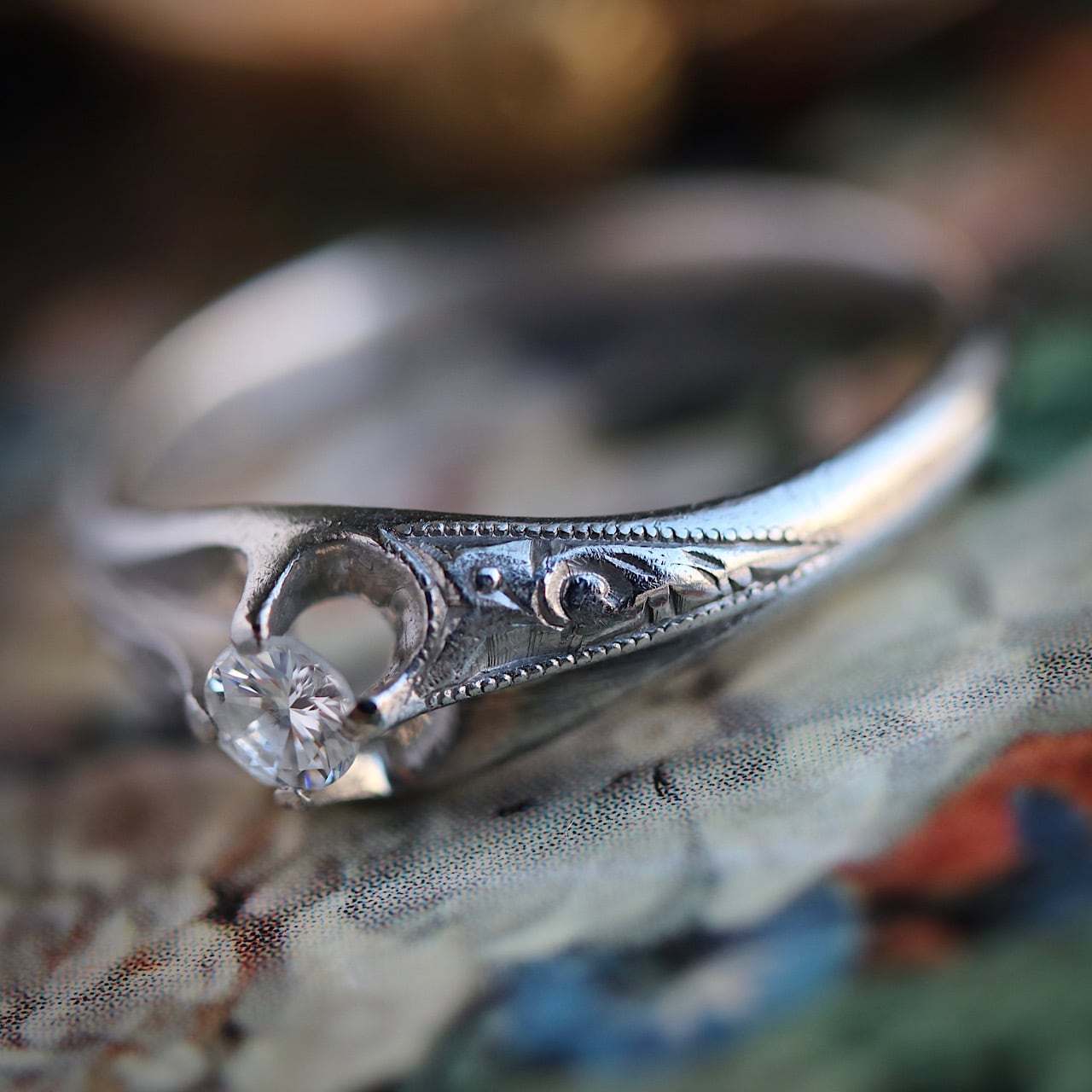 Pt プラチナ製 一粒ダイヤモンド 和彫 花爪 ヴィンテージリング