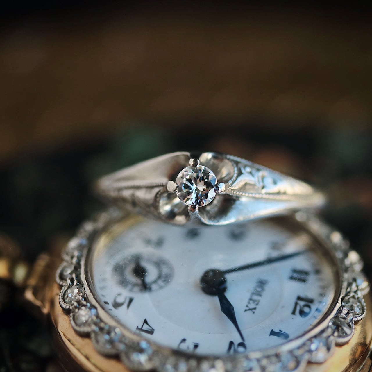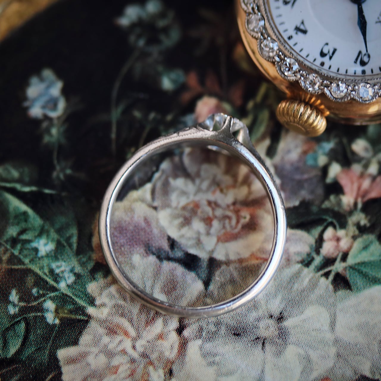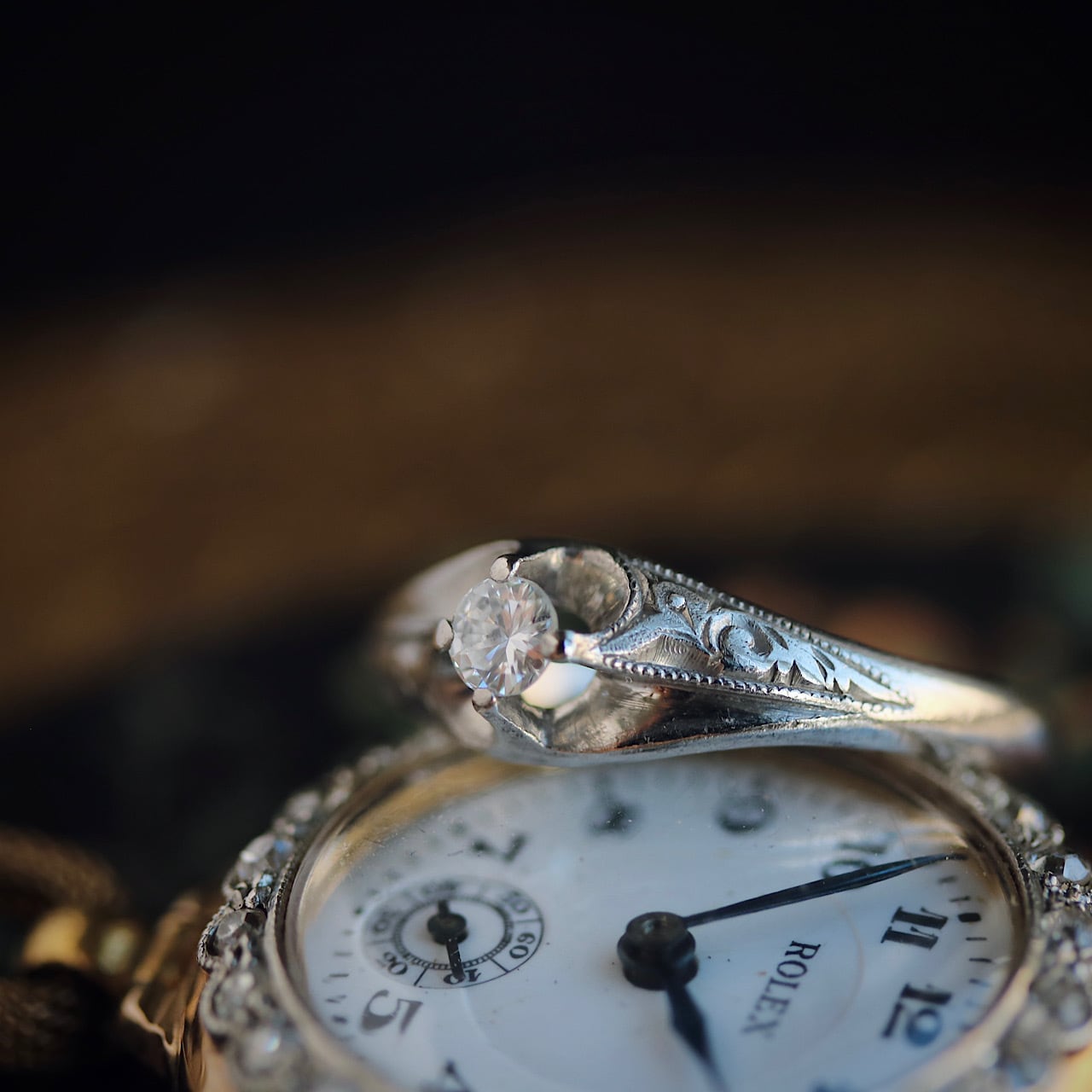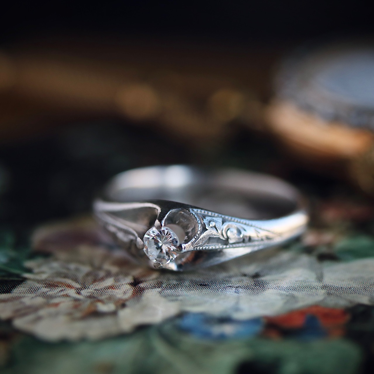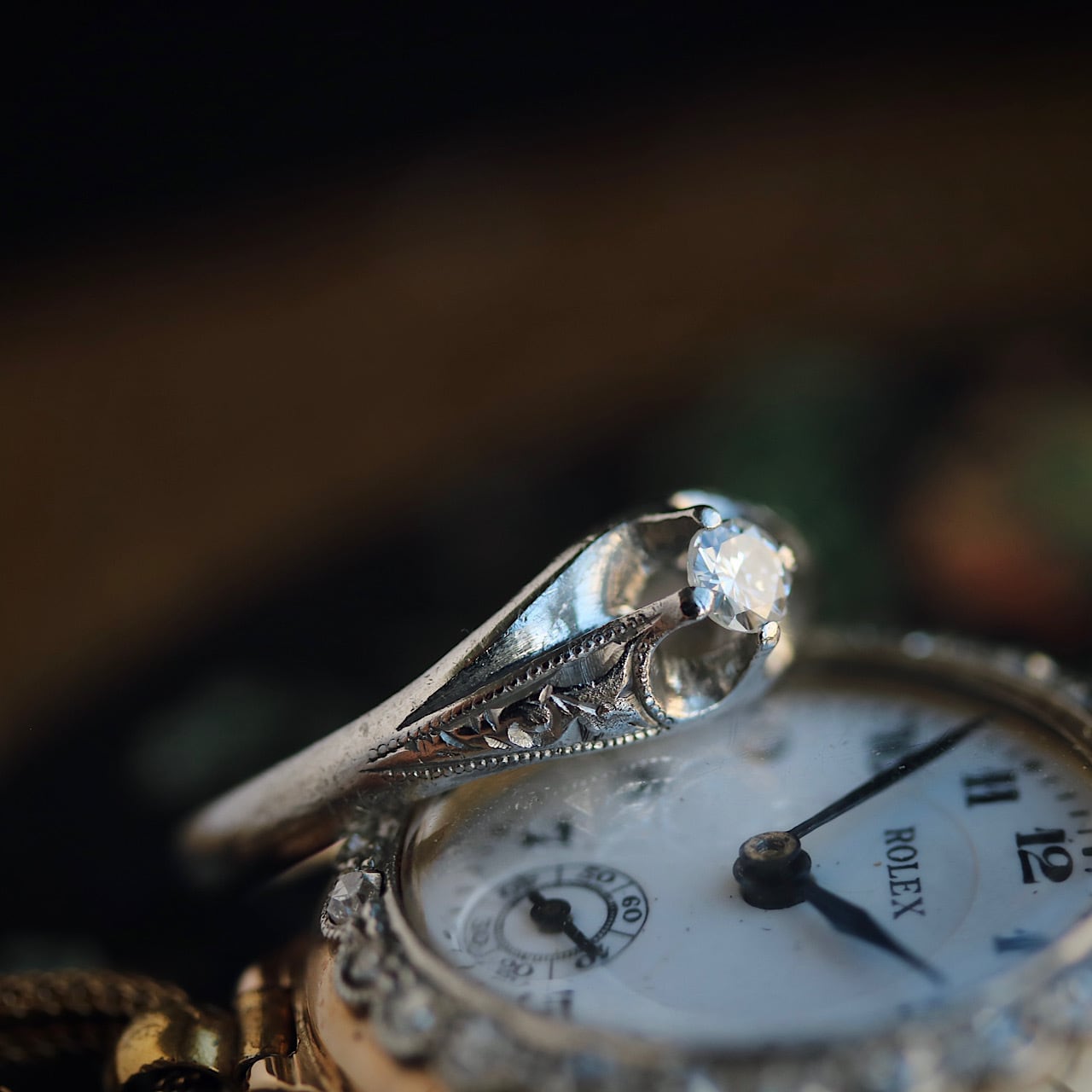 Pt プラチナ製 一粒ダイヤモンド 和彫 花爪 ヴィンテージリング