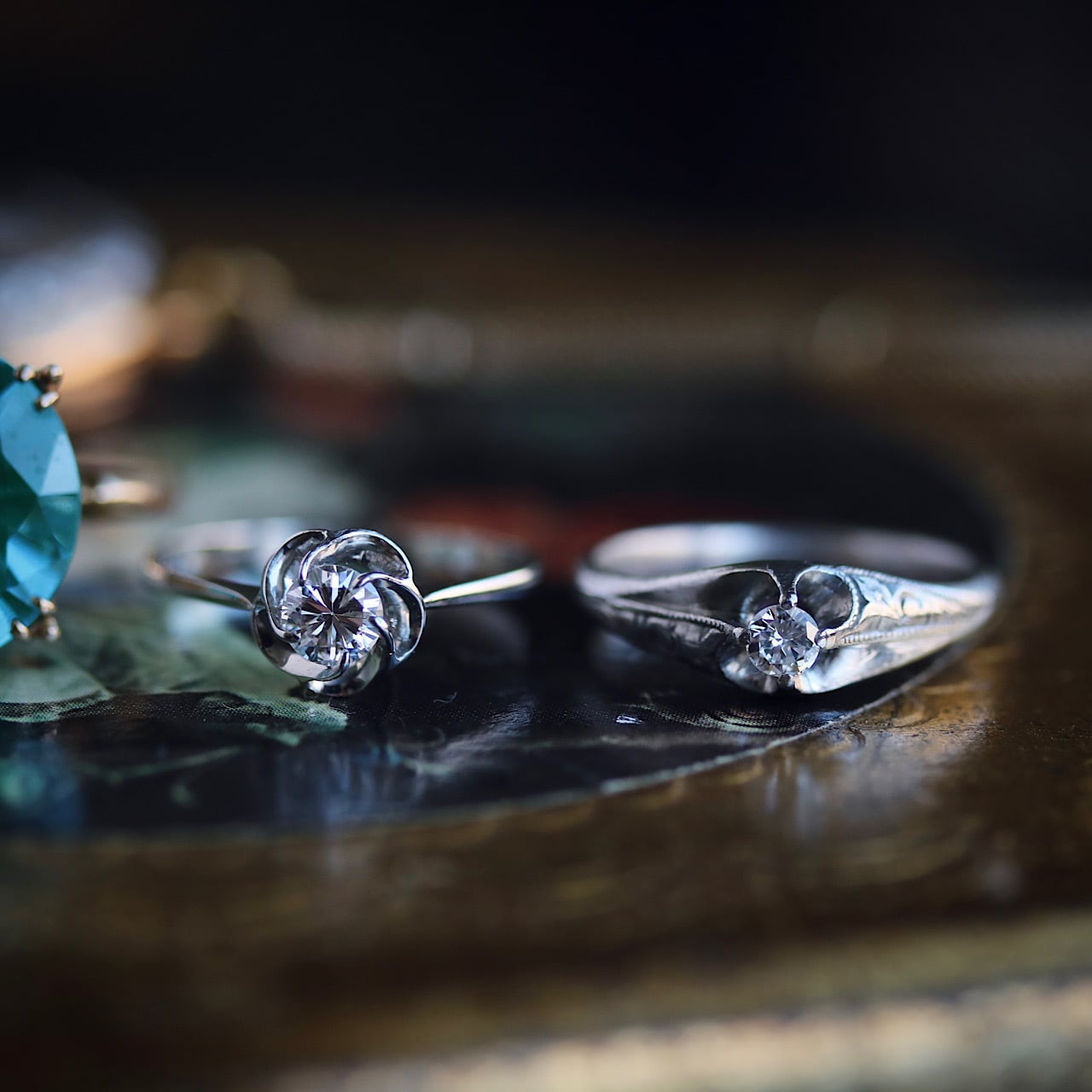 たった4つの小さな爪で留められたダイヤモンドは、サイドから見た時には石が浮いているかのようにも見えます。