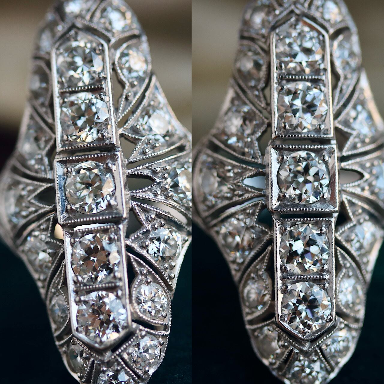 プラチナ製の白い地金には贅沢にもオールドヨーロピアンカットのダイヤモンドがたっぷりと散りばめられており、縦一列に配置された四角い枠のダイヤモンドと区切られた繊細な透かしの空間の使い方にセンスの良さが感じられます。