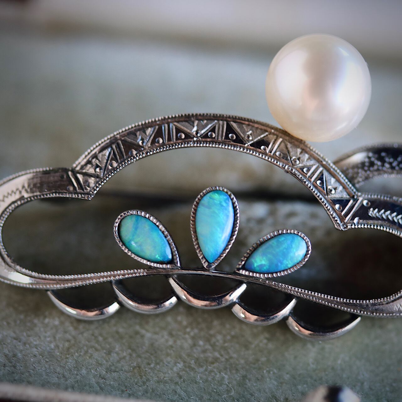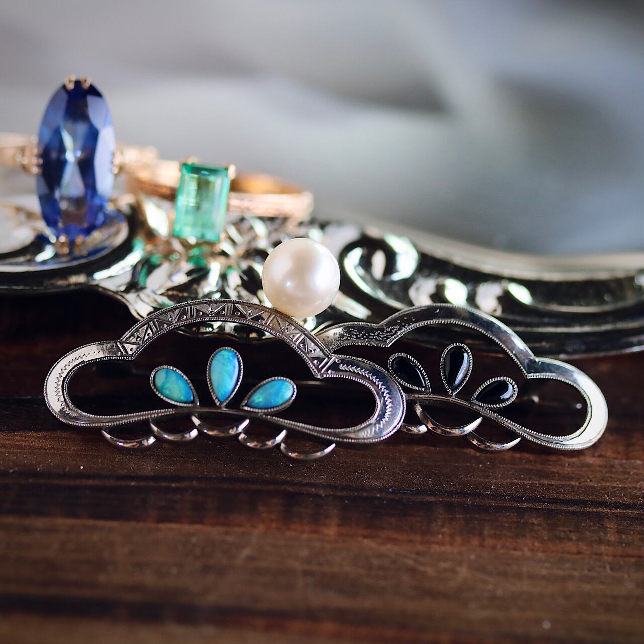 あこや真珠やブラックオパール、オニキスで飾られた贅沢な逸品です。