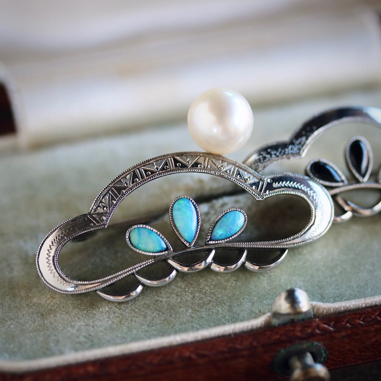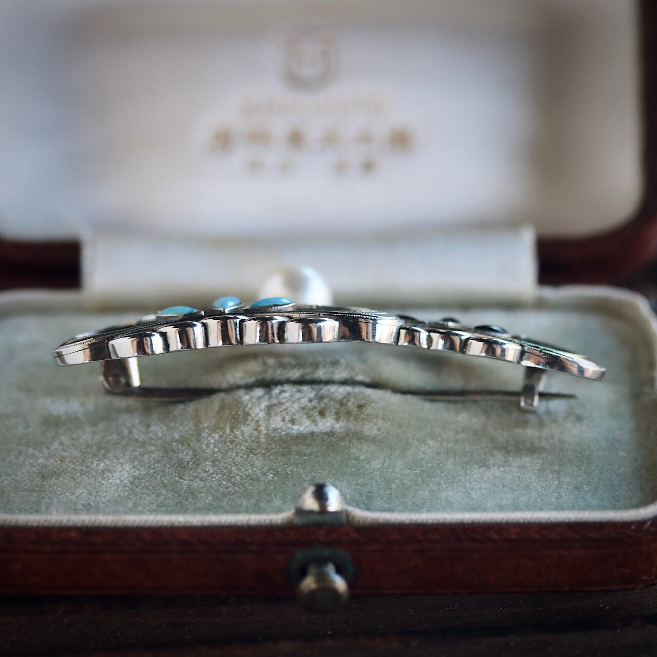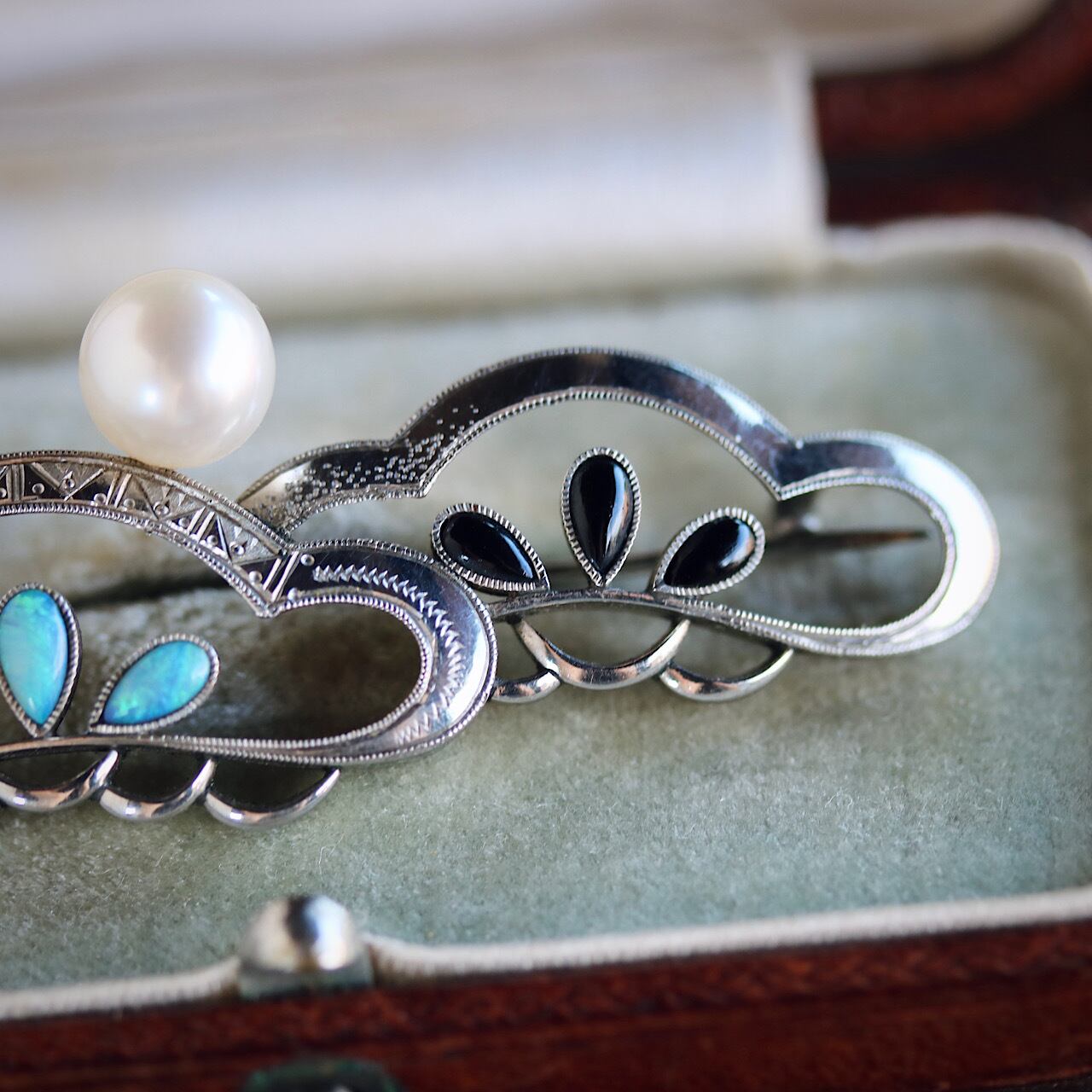 合金製 あこや真珠 天然ブラックオパール 天然オニキス 笠松モチーフのヴィンテージブローチ ソーティングメモ付