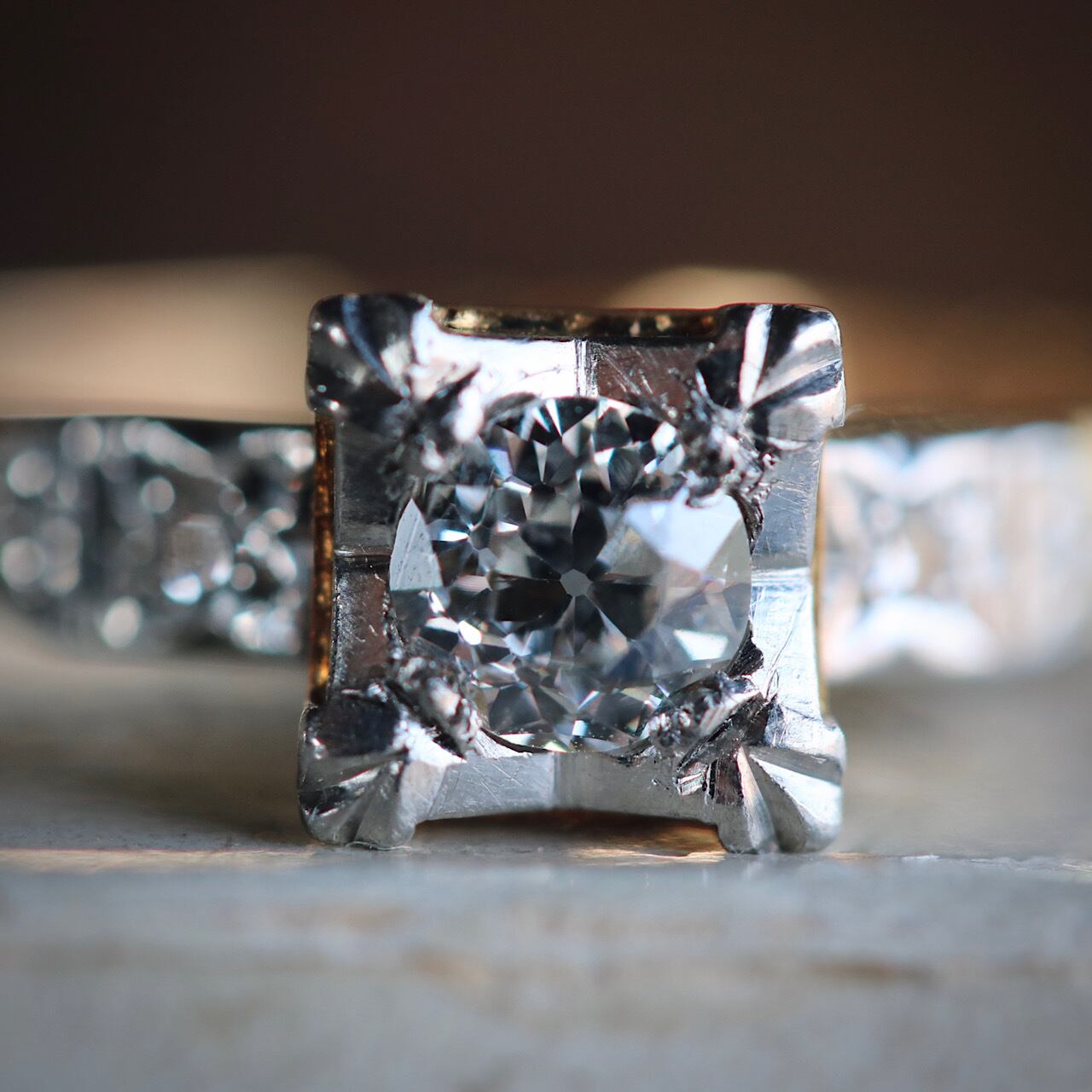 中心に輝くオールドヨーロピアンカットダイヤモンドはオールドカットならではの味わい深い輝きのもの。