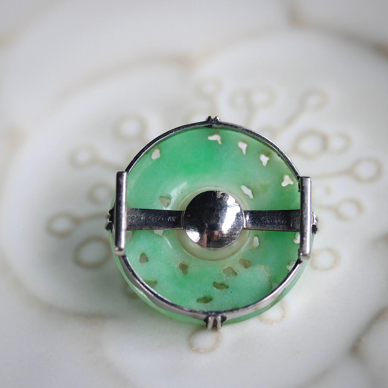 花透かし彫りの翡翠とあこや真珠の色の対比が美しいアールデコの帯留め。