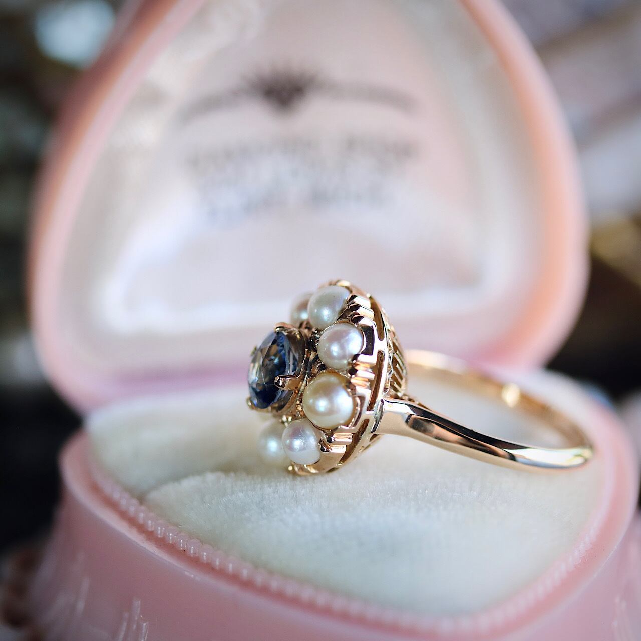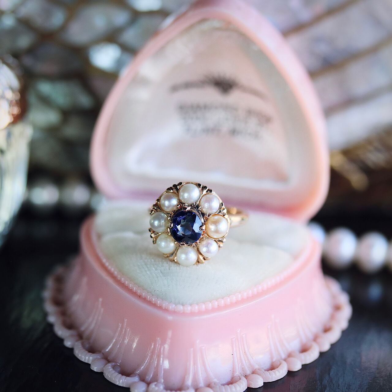 天然サファイアにベビーパールが取り巻くようにセッティングされた華やかなヴィンテージリング。