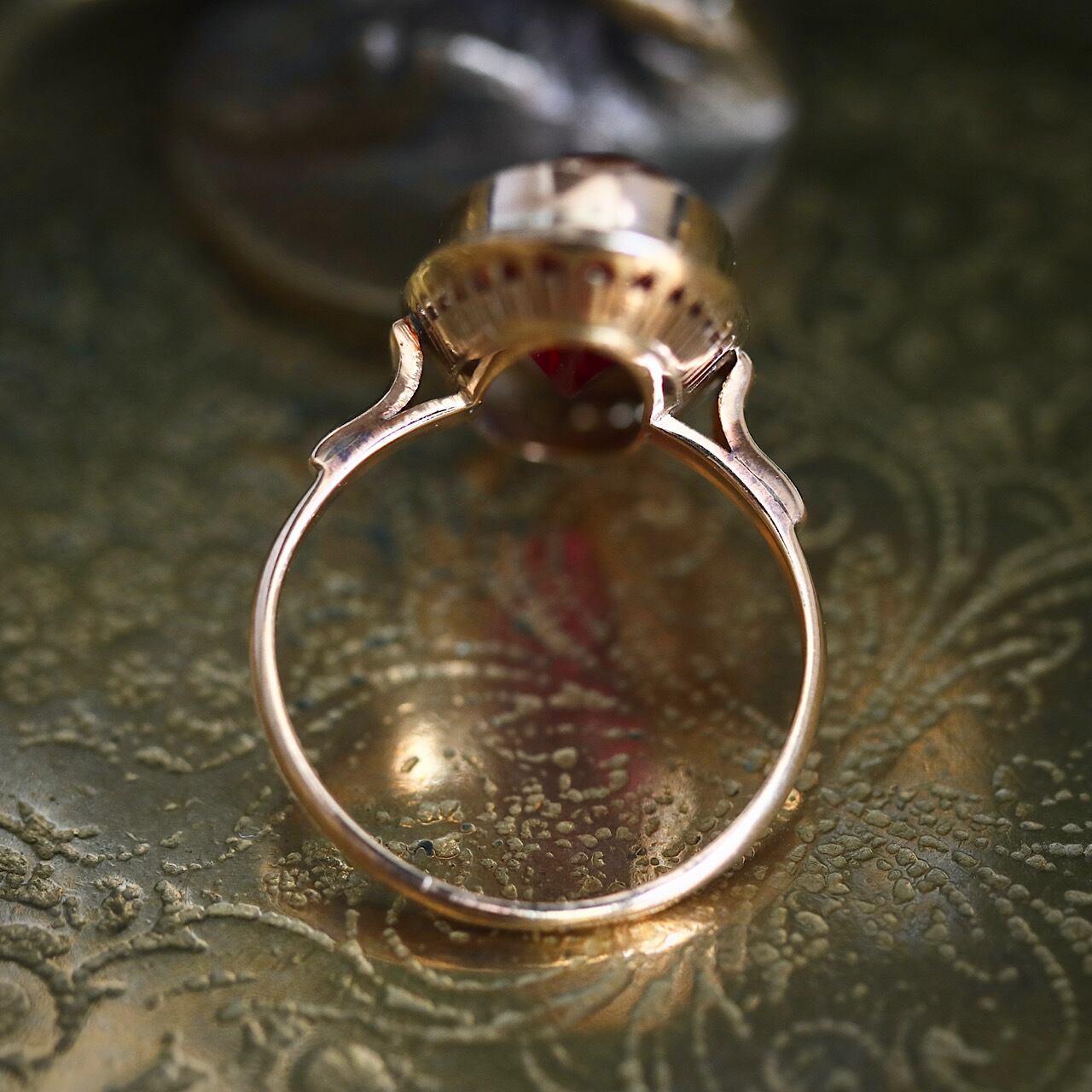 18金製の台には繊細なミルグレインが石を縁取るようにぐるりと施され、裏側には昭和30年代に流行したハンドメイドの王冠透かしが施されています。