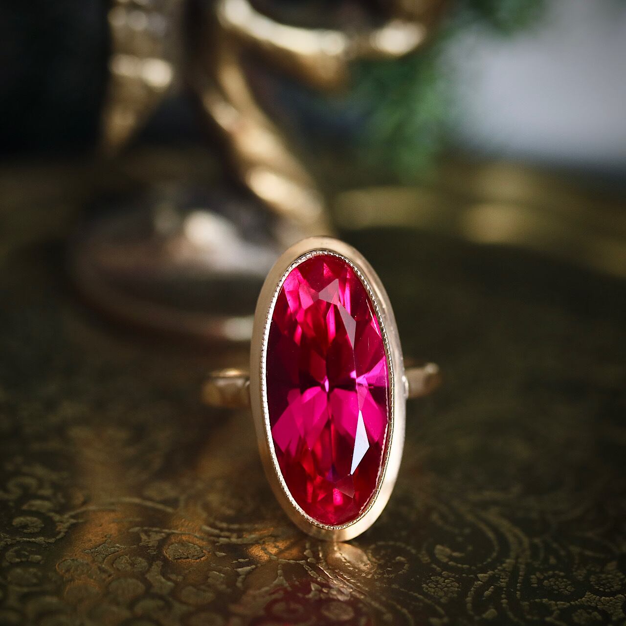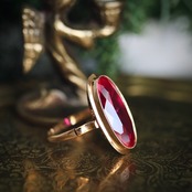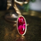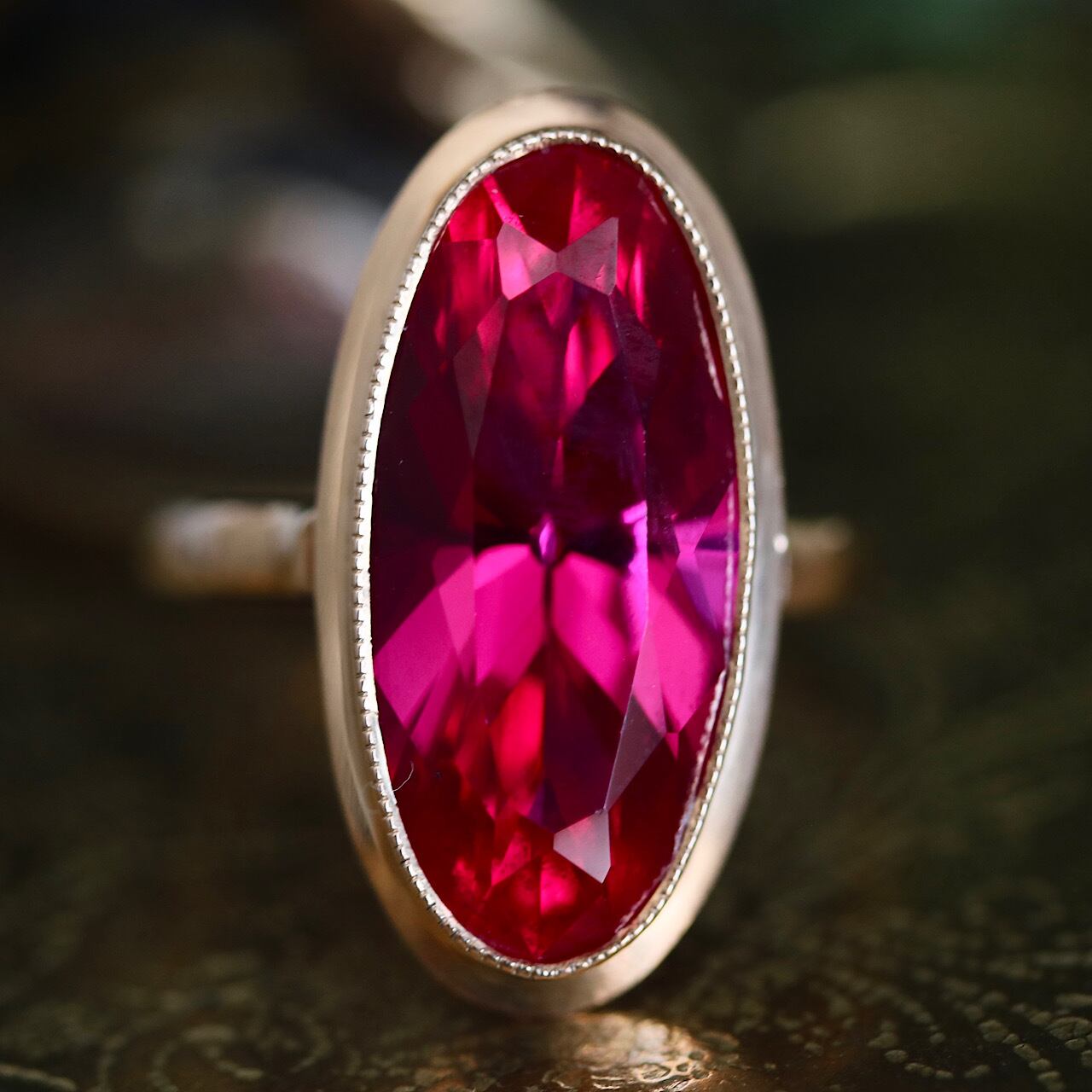 ベリーピンクの大きな合成ルビーが苺の大粒ドロップのような、甘く美しいリングです。