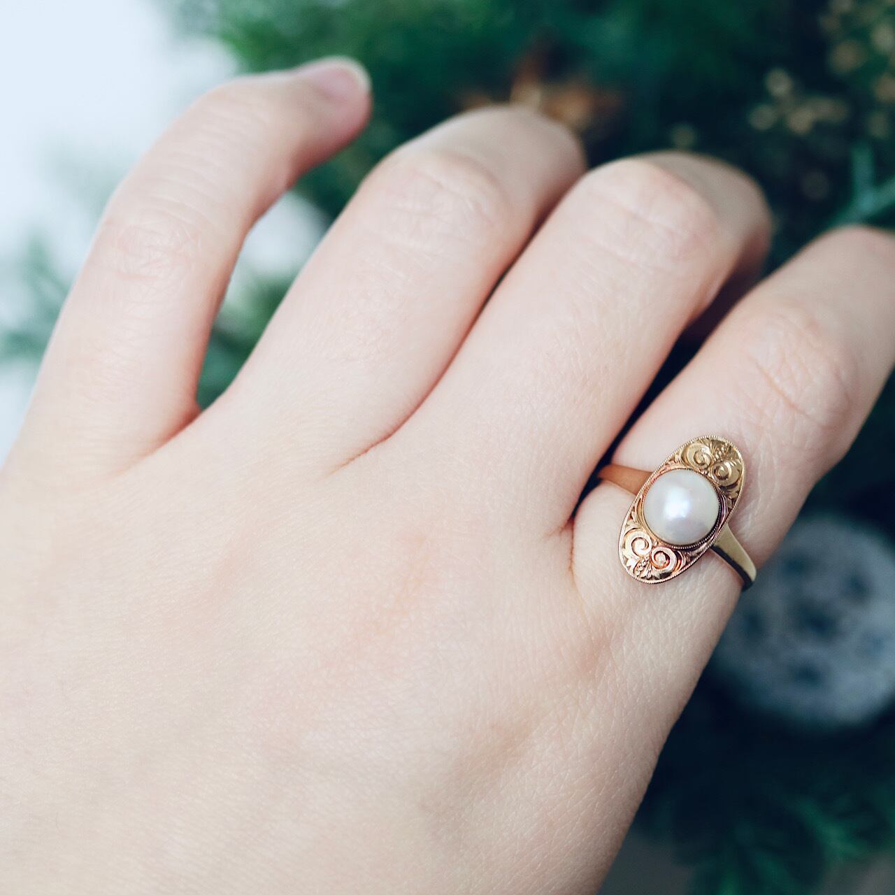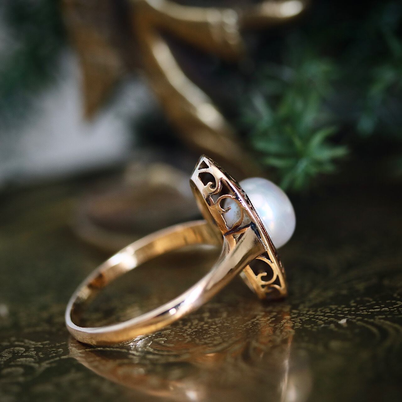 K18 一粒あこや真珠のアールデコリング。