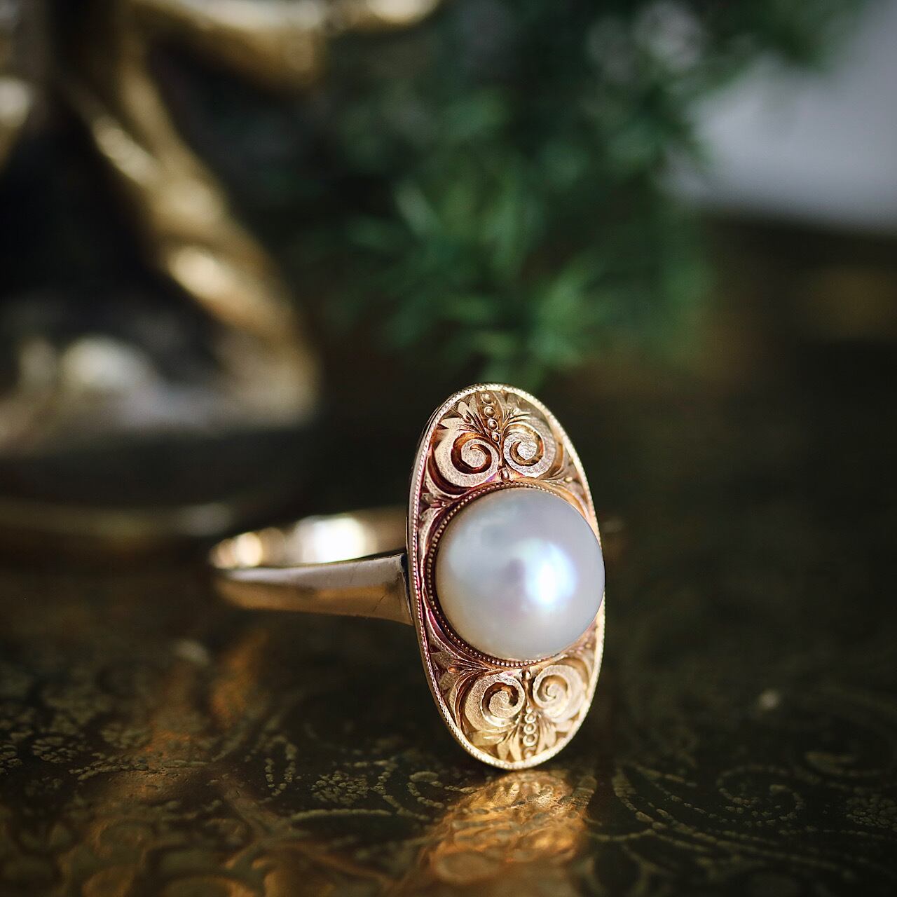 一粒のあこや真珠を中心に、美しい唐草模様の彫金が施された芸術性の高い逸品。
