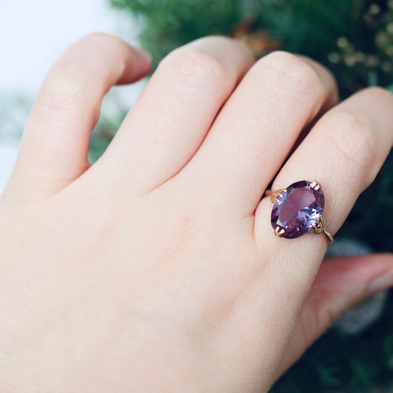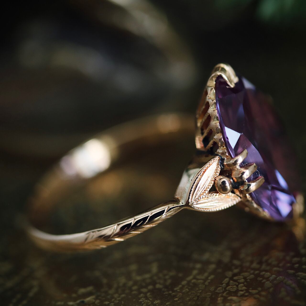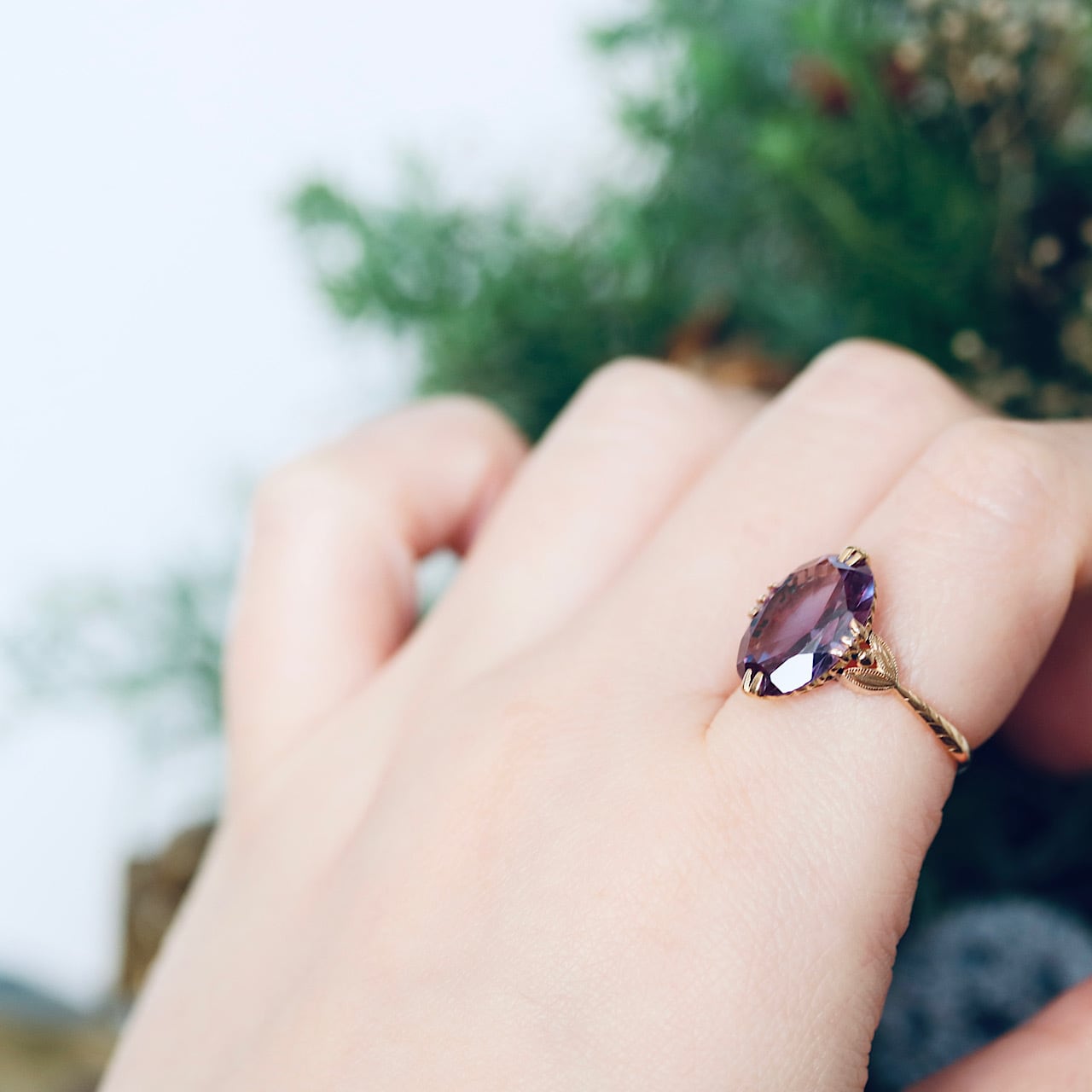 合成パープルサファイアに添えられた葉の意匠が優美なヴィンテージリング。