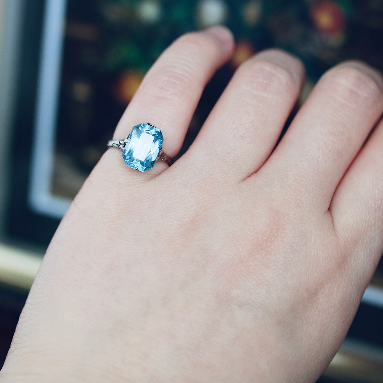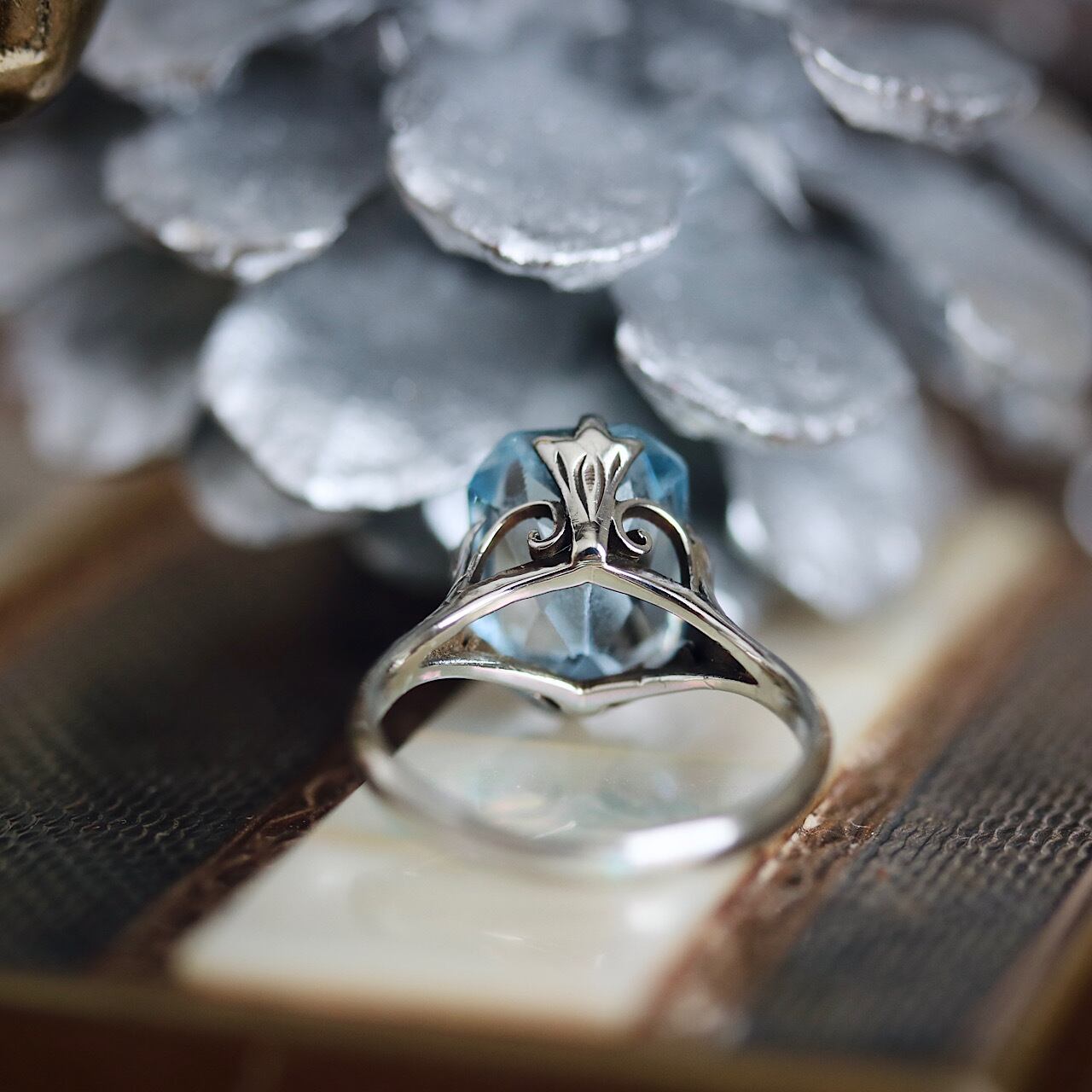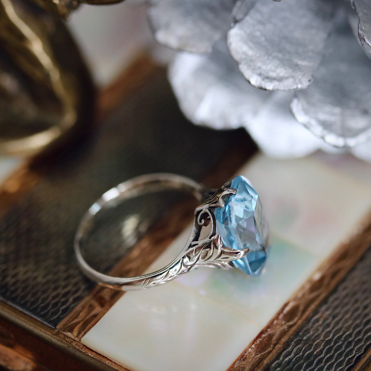18金WGブルー合成石の和彫ヴィンテージリング 。