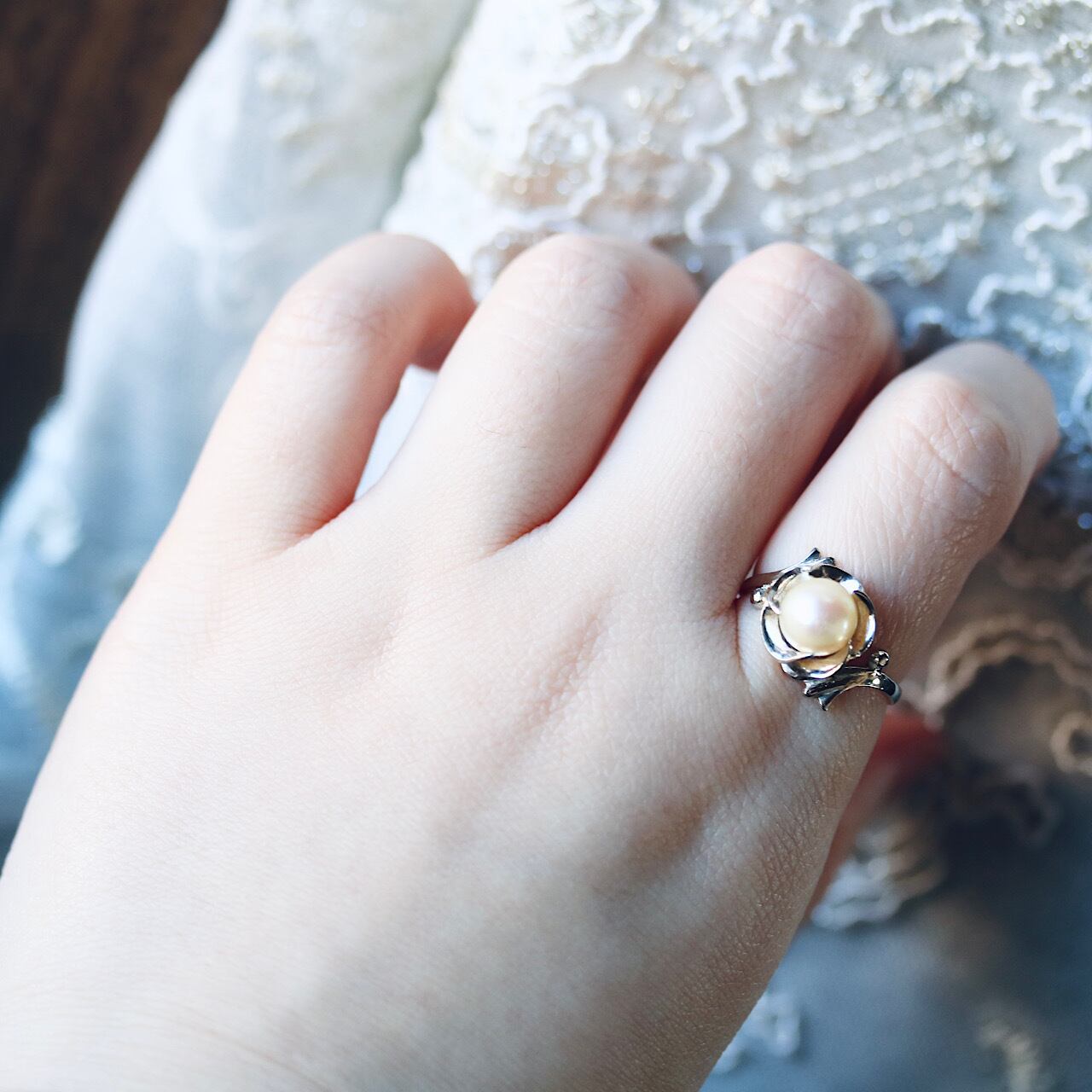 一粒の美しいあこや真珠がセッティングされた捻り梅のリング。