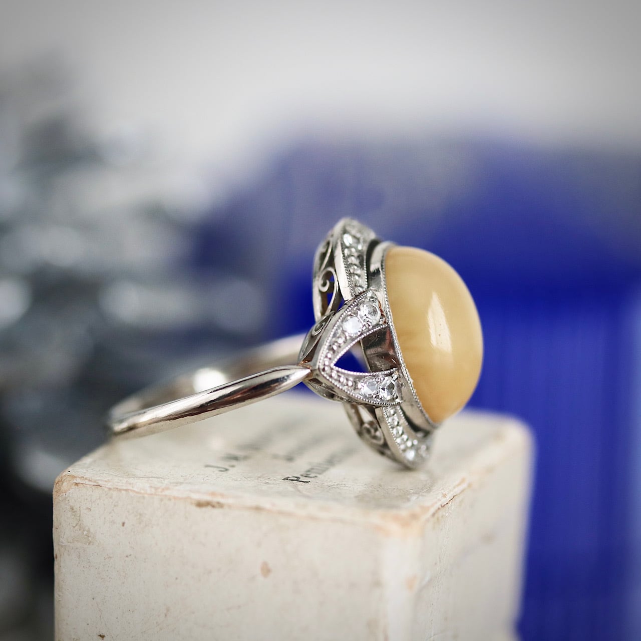 尼伊製 PM プラチナ製 大粒ムーンストーンキャツアイのヴィンテージリング 大正末〜昭和初期頃。