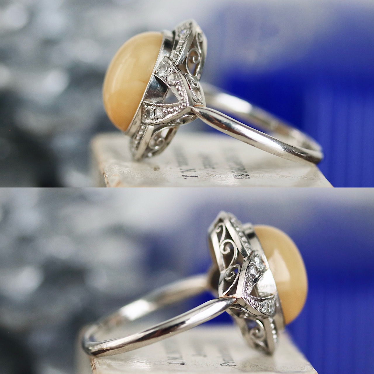 透かしを効かせたモダンなデザインで覆輪留めのムーンストーンの周りには透明石と細やかなミルグレインが丁寧に施されています。