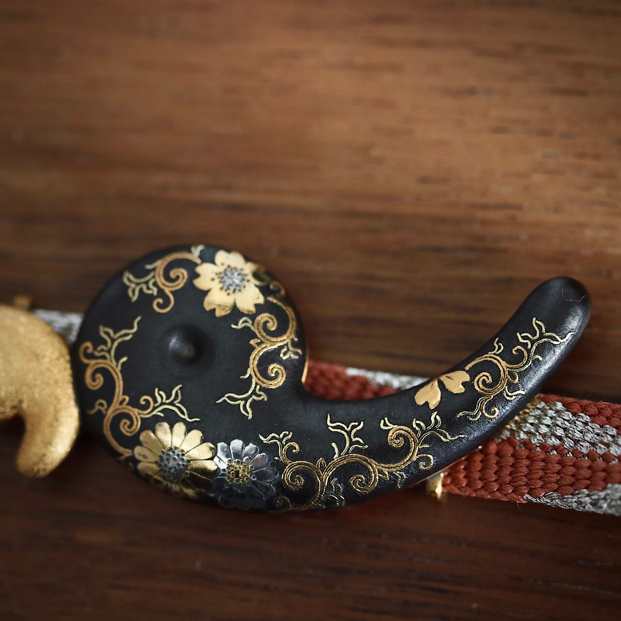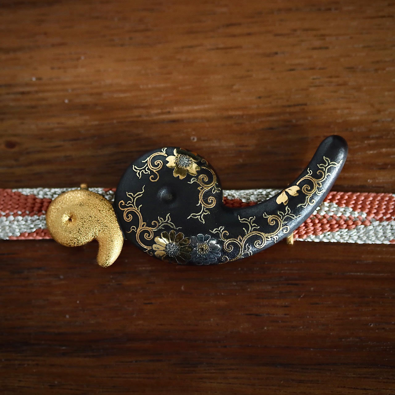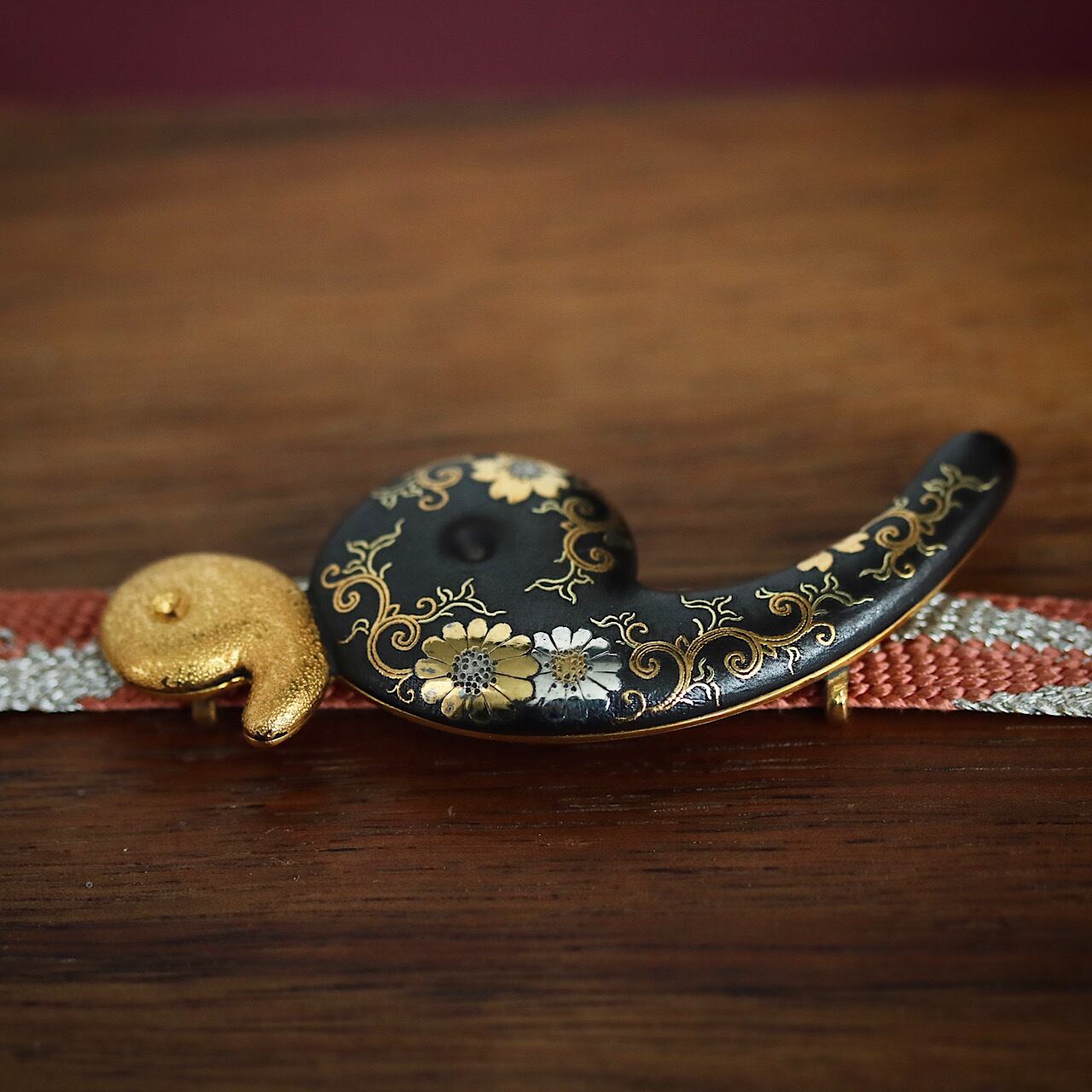 煌びやかな金銀象嵌で装飾された勾玉の帯留め。