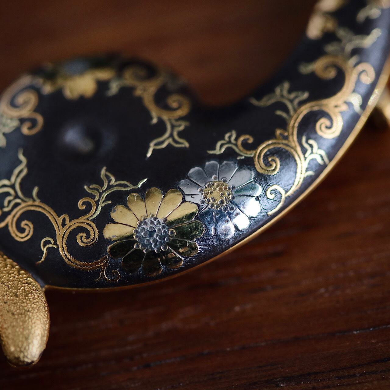 赤銅の黒い地金には、金銀象嵌の技法により美しい菊の花と緻密な唐草模様が精巧に描かれています。