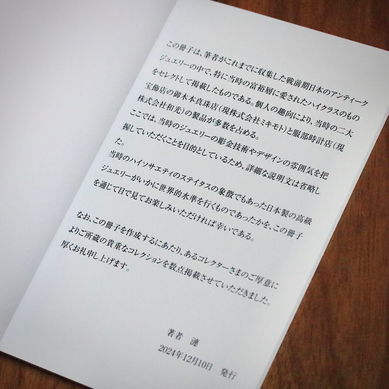 今回は、筆者である漣様がこれまでに収集した戦前期日本のアンティークジュエリーの中で、特に当時の上流階級に愛されたハイクラスのもののみを特別に選んで一冊に纏めあげました。