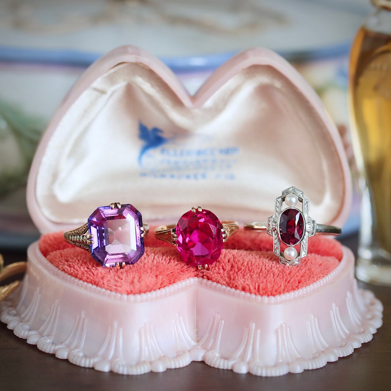 昭和5年に製造されたと分かる、貴重なカタカナの「イ」刻印が打たれた合成パープルサファイアのヴィンテージリングです。