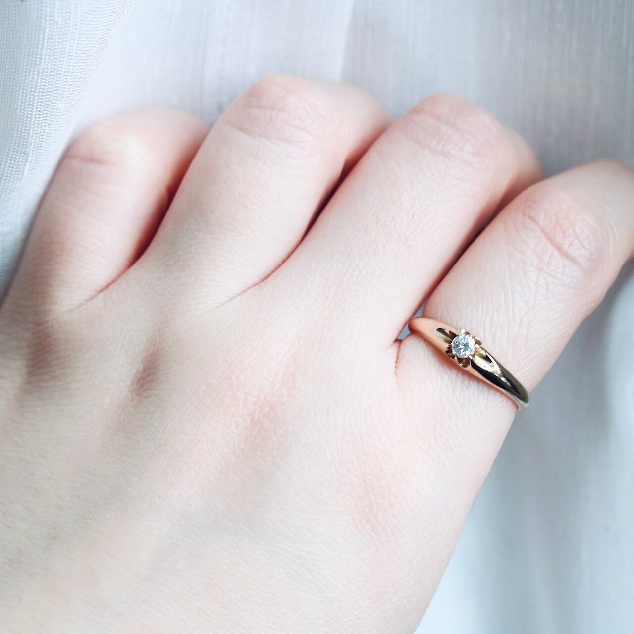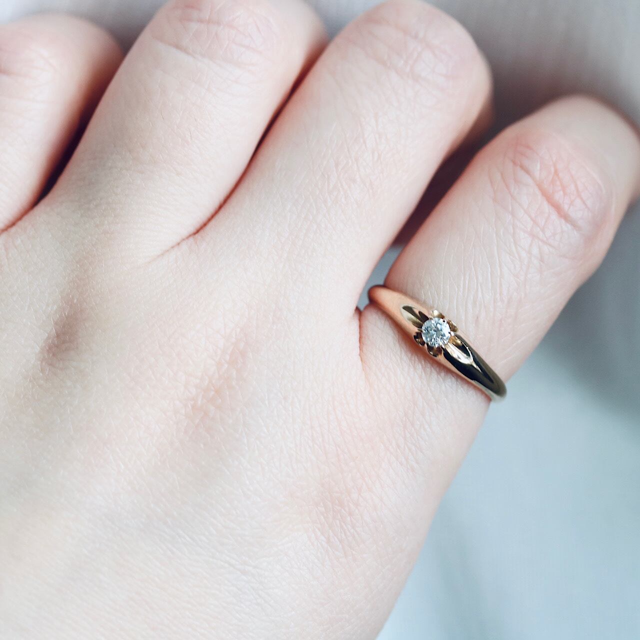 艶やかな18金に美しいダイヤモンドがあしらわれた生子型の菊爪リング。